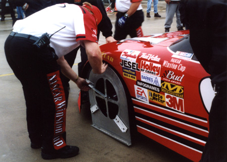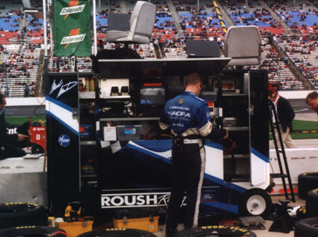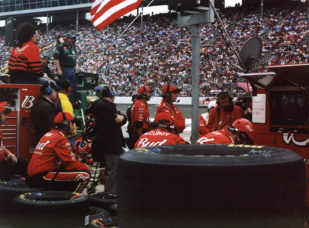I missed most of the first pit stop because two DEI executives entered the pit and stood right in front of me, blocking my view. After it was over, I ate my burrito (Mom said she warmed hers up by laying it (in foil) on the side of one of Rusty's used tires. She also notes that when the tires came off the car, the sidewalls were hot, but the side that touches the track (what do you call it if it doesn't have tread?) was relatively cool.