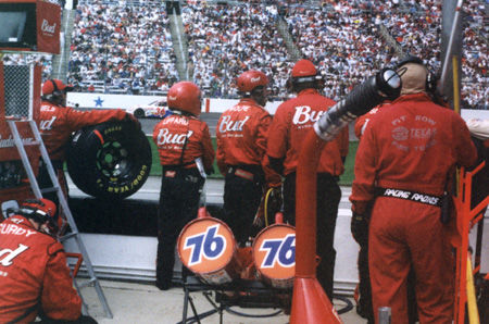 Mom stayed in Rusty's pit. When a newbie walked up and asked a crewmember why he was putting orange tape on the tires, the crewman said, "Because the tire changer is nearly blind, this is so he knows where to put the tire on." Then the newbie asked why he was painting the lug nuts pink. The crewman said, "So he can see them if he drops one." The fan just nodded as though it made all the sense in the world, all the while my mom is about to bust a gut. The crewman who answered him WAS the tire changer, and he was marking his own tires.