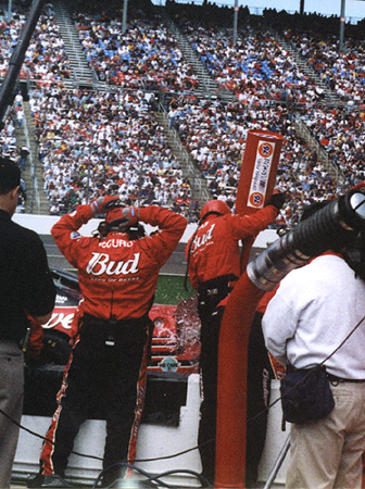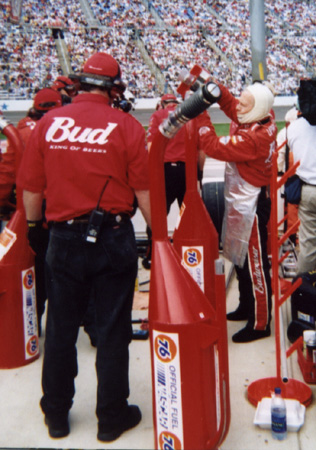 When I dropped my second Coke, I knew it was going to be a bad day. This time it cracked the bottle and started spewing. My quick reflexes allowed me to use my foot to roll it over before picking it up and throwing it away. Since there was hardly anyone left in the pits, I decided I wouldn't lose my place going to get another, but I wanted to wait until after the first pit stop.